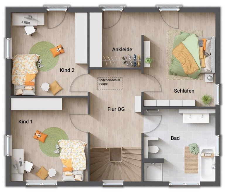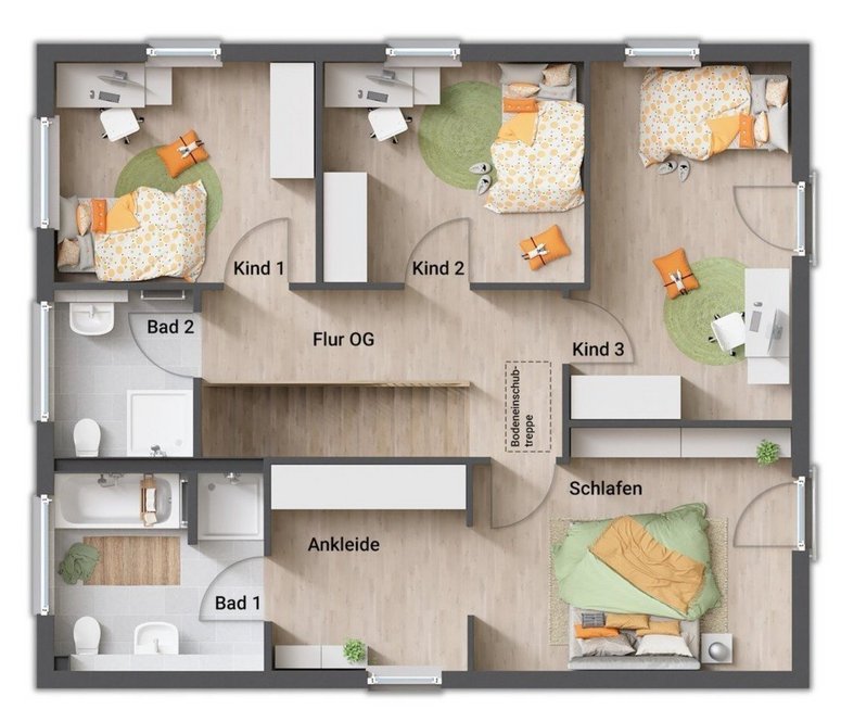 Auch das Obergeschoss zeigt sich im gradlinigen Baustil des Hauses. Hier finden Sie drei Zimmer, die Sie nach Ihren Vorstellungen als Schlaf-, Kinder- oder Gästezimmer nutzen können. Große Fenster lassen auch hier viel Tageslicht hineinströmen. Die Ankleide im Schlafzimmer bietet viel Stauraum.