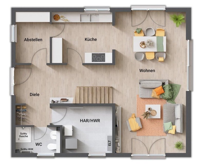 - gerade Treppe (zentral im Erdgeschoss, „teilt“ Koch- und Wohnbereich)